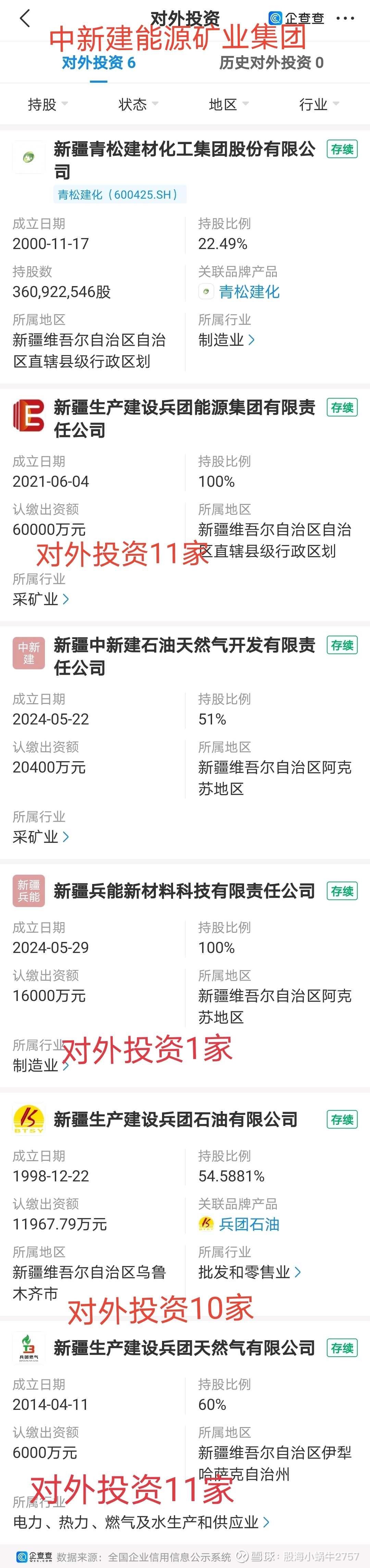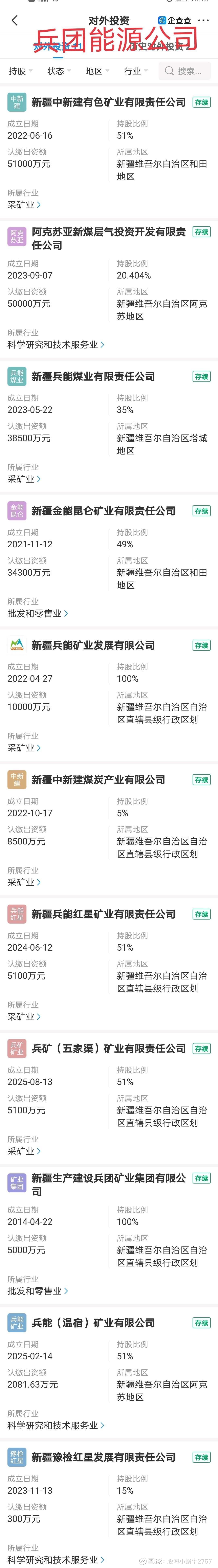 中新建能源矿业集团有限公司,既是新疆生产建设兵团的油气矿产资源开发平台,也是上市公司青松建化的控股股东,是2023年为开发油气矿产资源而专门设立的平台公司!但是从旗下公司的设立时间看,兵团至少是3年前就在为此做准备了!大量的子公司2025年集中设立的,说明资产整合的进程在加快!
