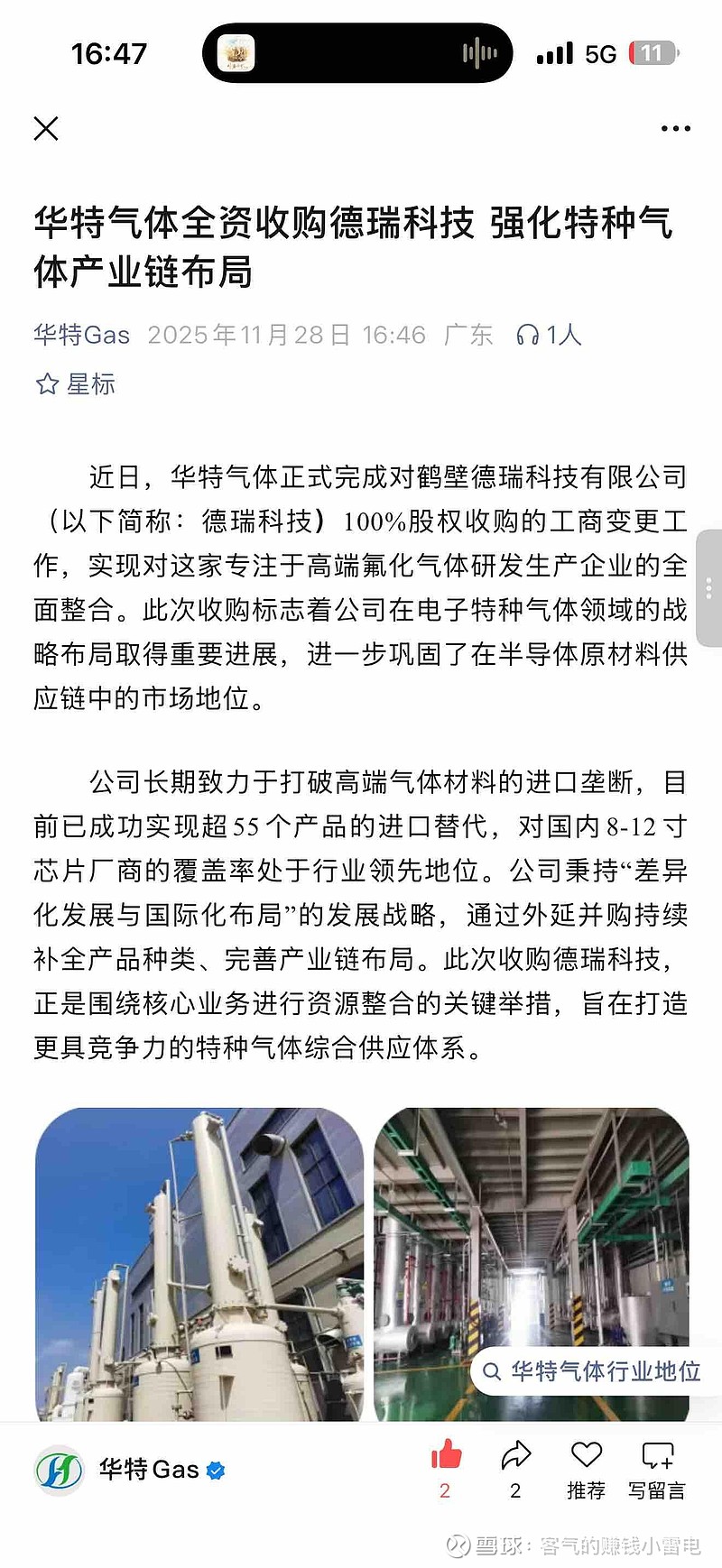 $华特气体(SH688268)$ $中芯国际(SH688981)$$华润微(SH688396)$ 电子特种气体作为芯片制造的第二大核心材料,被广泛应用于半导体芯片制造的各个工艺环节。技术的不断进步和市场需求的逐步释放将带动电子特种气体的需求增长。去年,华特气体针对集成电路、第三代半导体、光掩模、MEMS等细分市场,强化定制化服务能力,以“小批量、高价值”产品弥补传统领域需求缺口。在第三代功率器件半导体方面,产品满足碳化硅(SiC)与氮化镓(GaN)等第三代半导体的生产需求。华特气体产品也已进入到全国最大的氮化镓生产厂商和碳化硅生产厂商供应链。华特气体的下游客户覆盖中芯国际、长江存储、华虹宏力、华润微、SAMSUNG、SKHynix、TSMC等全球领先客户,特种气体品种数和收入居于国内气体公司前列;产品覆盖国内90%以上的8-12寸芯片制造企业;公司超55个产品可供半导体厂应用,并且公司的部分氟碳类产品、氢化物已进入到5nm的先进制程工艺中应用并不断扩大覆盖范围。