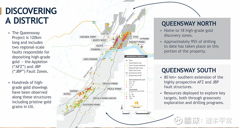 New Found Gold Corp.(AMEX: NFGC) $New Found Gold(NFGC)$ 是一家总部位于加拿大温哥华的矿产勘探公司,专注于在纽芬兰和拉布拉多省以及安大略省的矿产资源识别、收购和勘探。该公司全资拥有位于纽芬兰甘德以西15公里处的Queensway黄金项目,面积约1,756平方公里。目前,公司正在进行一项总计65万米的钻探计划,重点关注Appleton断层带沿线超过22公里的走廊以及JBP断层带沿线12.4公里的走廊。