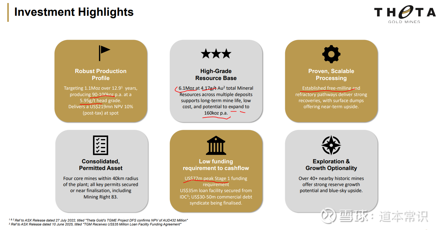 成本方面:该项目属于低资本支出型,已具备尾矿坝和约 100 公里现成地下巷道。资本开支 US$77m,AISC ~US$834/oz。—这个初始成本和ASIC真的很低,很多项目就是因为初始成本几亿美金融不到资,只能搁置开发或者卖掉。因为是Greenfield矿什么配套都要自建,不是成熟矿二次开发,配套完善所以初始成本很低。