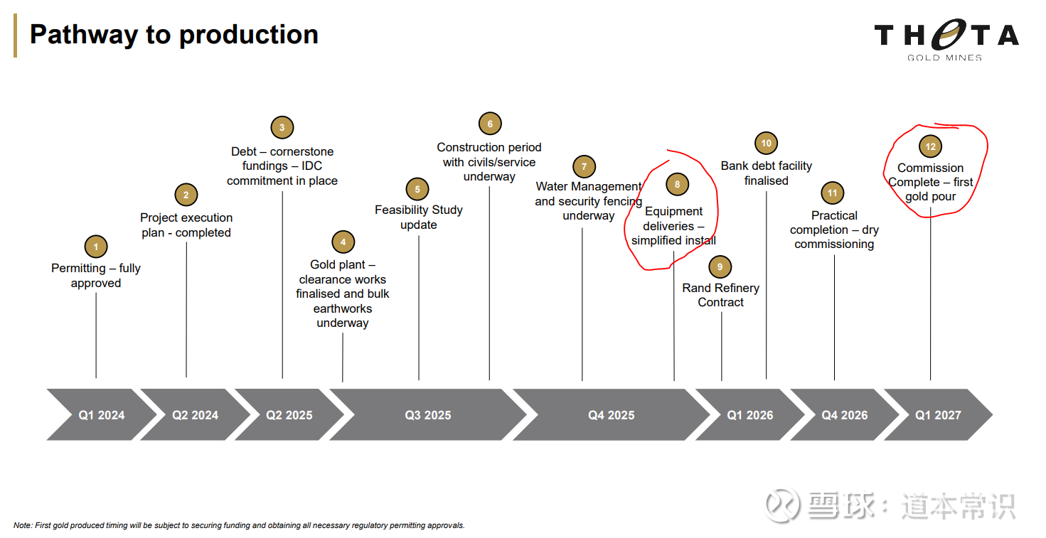 阶段定位:已DTM/“开采决策FID”通过,获IDC 6.22亿兰特(约US$35m)贷款批复,厂房前期施工已启动;关键许可(MR83、WUL 等)在手,处于建设前期的临界点,预计2027Q1产金。