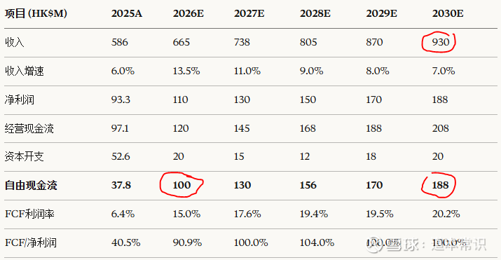 2026-2030年五年累计自由现金流预计约7.44亿港元。相对于当前约7.11亿港元的市值,这意味着以当前价格买入,仅靠未来五年的自由现金流就能几乎收回全部投资,还不包含五年后企业的终值。