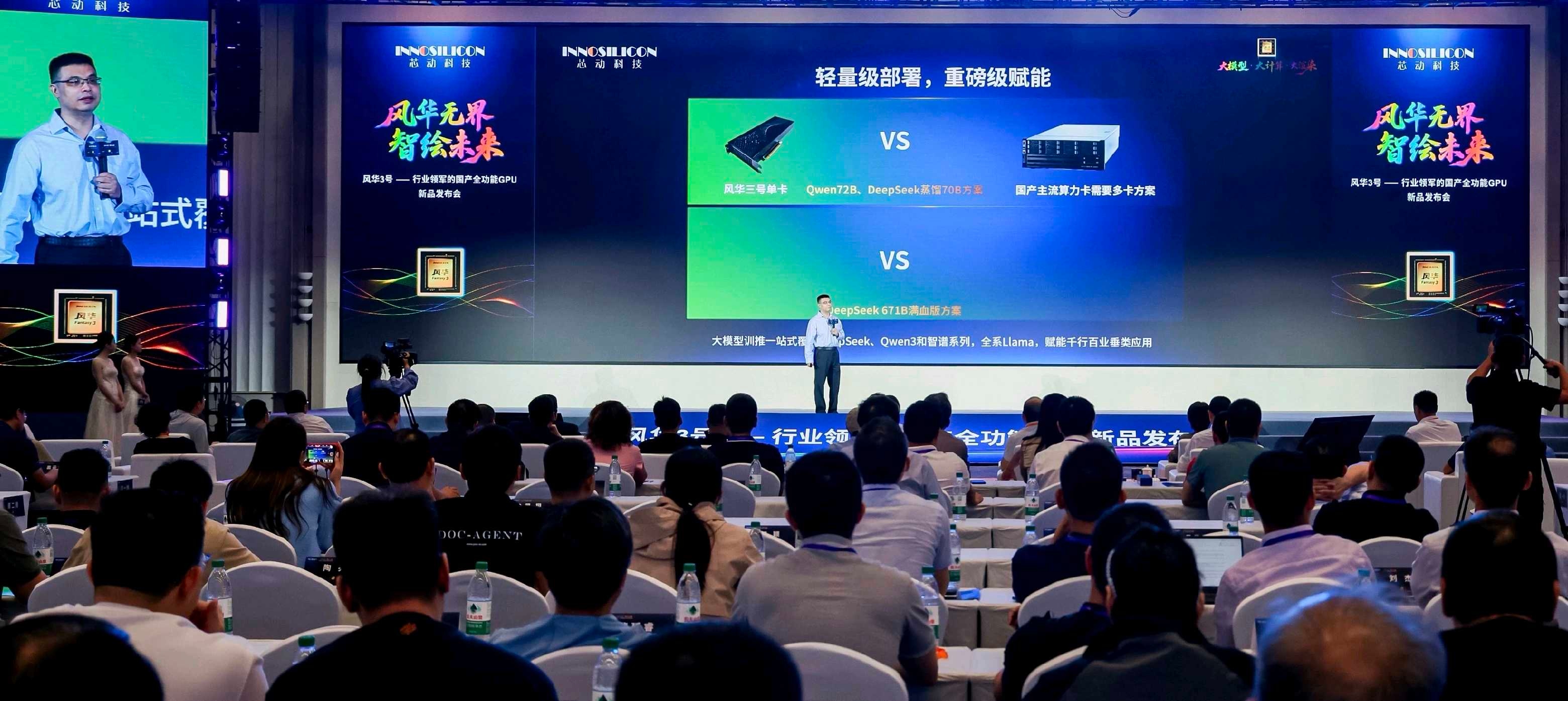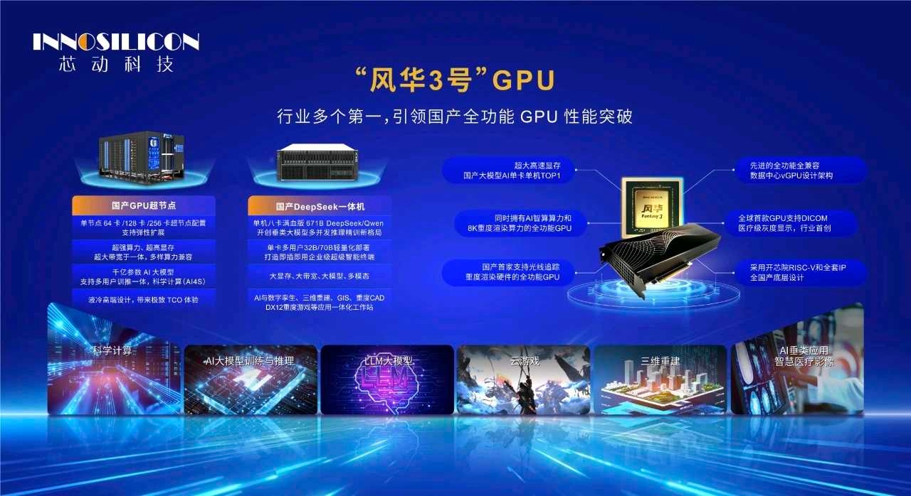 在大模型场景中,由于模型越来越大、参数越来越多,GPU的显存容量(存力)和带宽(运力)日益成为GPU的性能瓶颈。如果数据不能及时有效到达内核计算单元,所谓的算力并不能有效地实现大模型性能。针对存力和运力瓶颈,“风华3号”是国内首款单卡配备112GB+大容量高带宽显存和自研IP的全功能GPU,较国内外竞品,数倍提升了存力,有效地容纳AI大参数模型,突破目前国产GPU显存和多卡搬运的上限,单卡即能支持多用户32B/72B大模型, 多快好省地赋能各垂类大模型业务落地;单机八卡,更是能直驱DeepSeek 671B/685B 满血版大模型,达到了之前不得不多机部署的效果,精度一步到位,满足行业最苛刻的高智能化需求。“风华3号”对DeepSeek V3/R1/V3.1、千问Qwen2.5/3全系列、以及智谱GLM系列大模型兼容度“拉满”,支持多模态模型,实现了“轻量化部署,重量级赋能”的效果。
