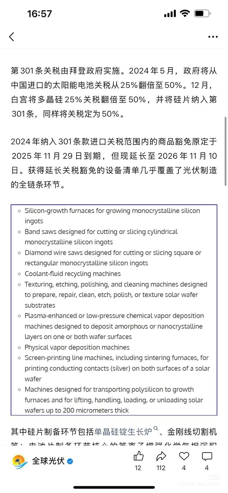 $捷佳伟创(SZ300724)$ $迈为股份(SZ300751)$ 光伏设备美国贸易代表办公室(USTR)决定将针对中国光伏制造设备的178项“301条款”关税豁免期限,从原定的2025年11月29日,延长至2026年11月10日,这项规定是11.26发布的。