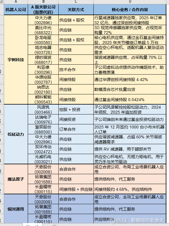 热度表现:A 股关联公司中,中大力德、奥比中光、卧龙电驱等核心供应链标的热度最高,2026 年 2 月以来股价异动明显,资金关注度持续攀升;间接持股标的(如华源控股、朗科智能)热度次之,主要受宇树 IPO 预期催化。