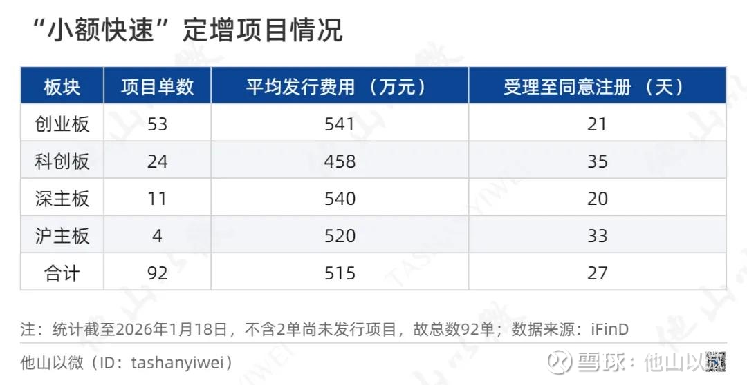 从审核状态看,截至1月18日,“小额快速”定增已完成发行92单。