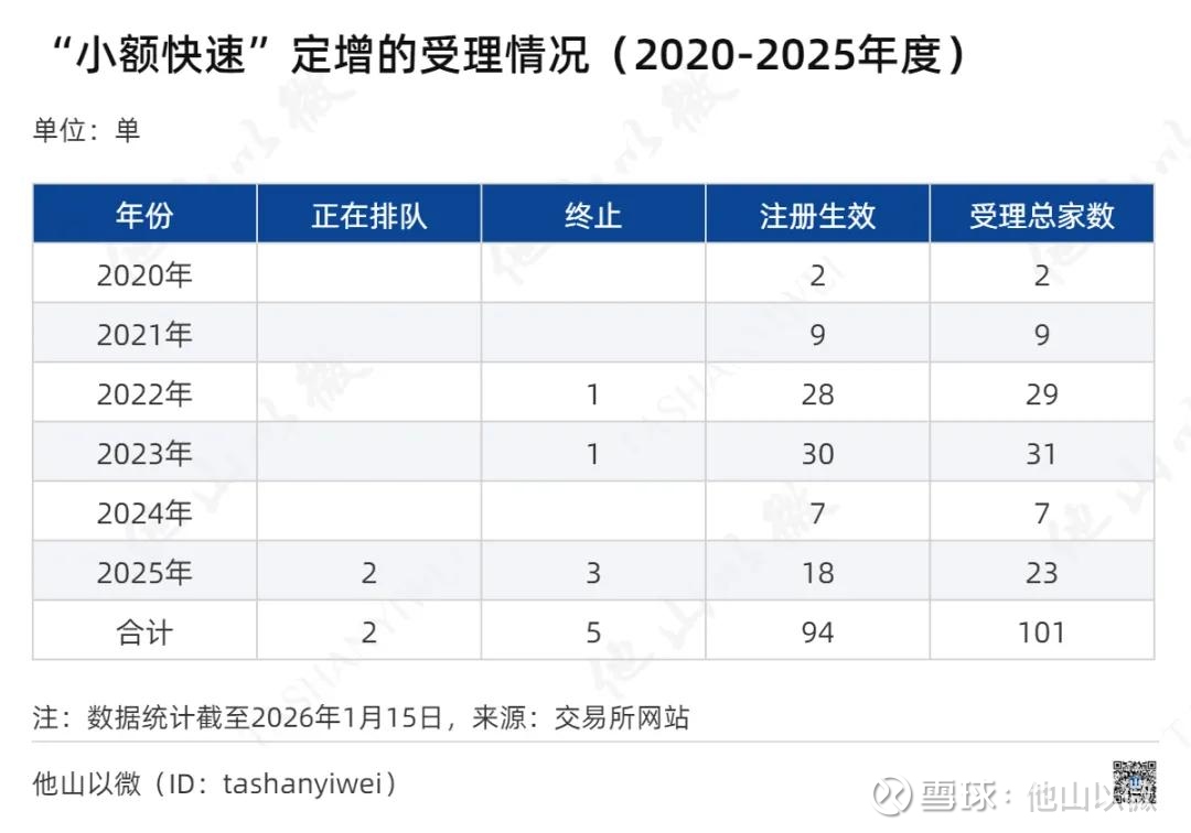 同花顺ifind数据显示,2020-2025年,沪深交易所累计受理“小额快速”定增101单。