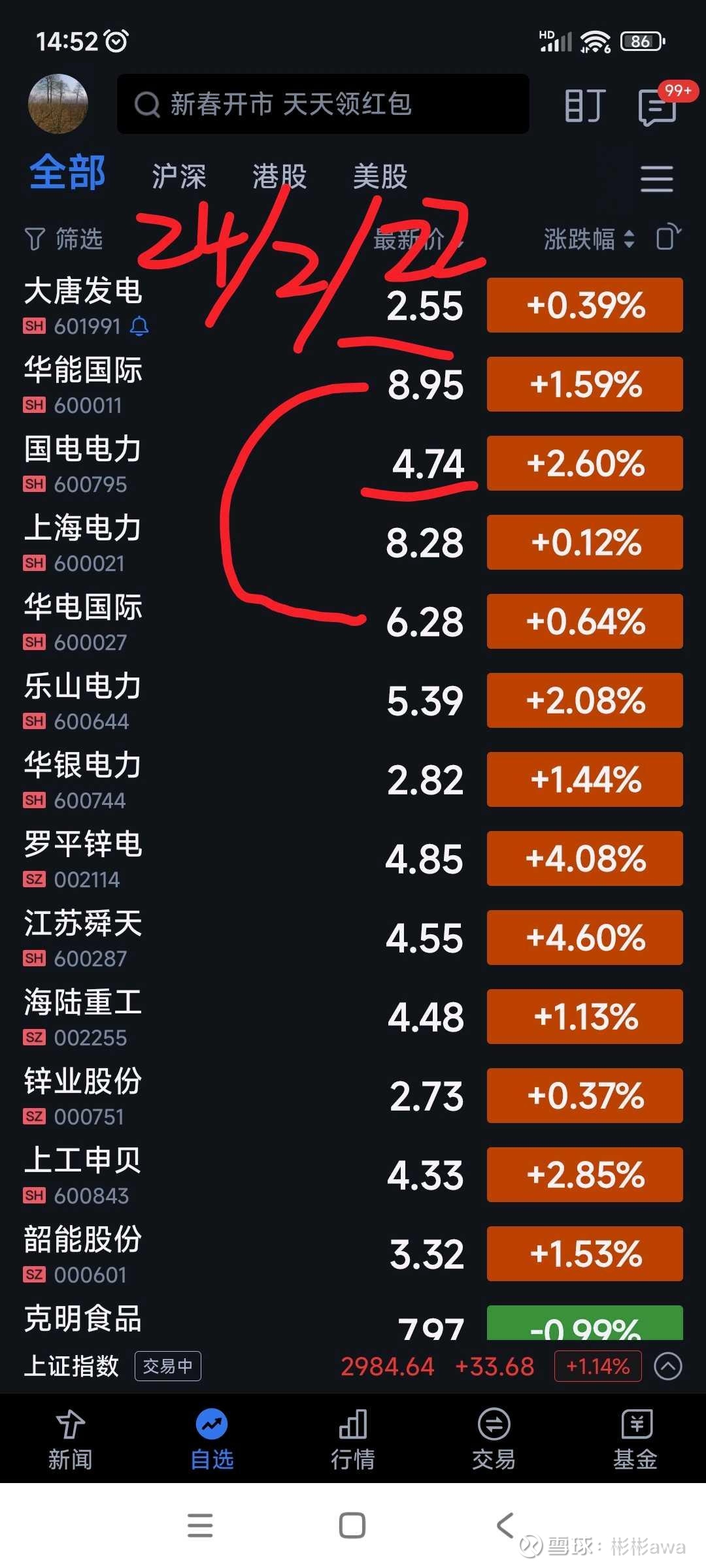 去年农历正月十三(上图开年后第1周工作日),华能华电股价较好,国电大唐价格稍低,当时我和剑王子思辨大唐发电A股价低迷,大资金持续打压至2.60元以下,仍不收手。