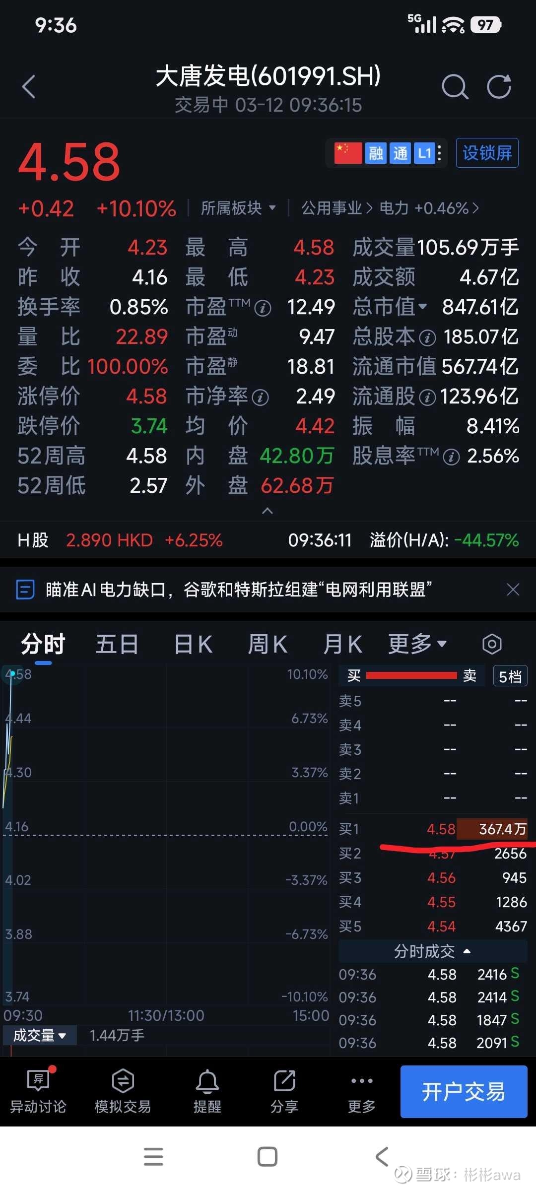3月12日早盘,大唐发电A股用一亿元(25万手左右),拉升封板,15个亿看门封住涨停。