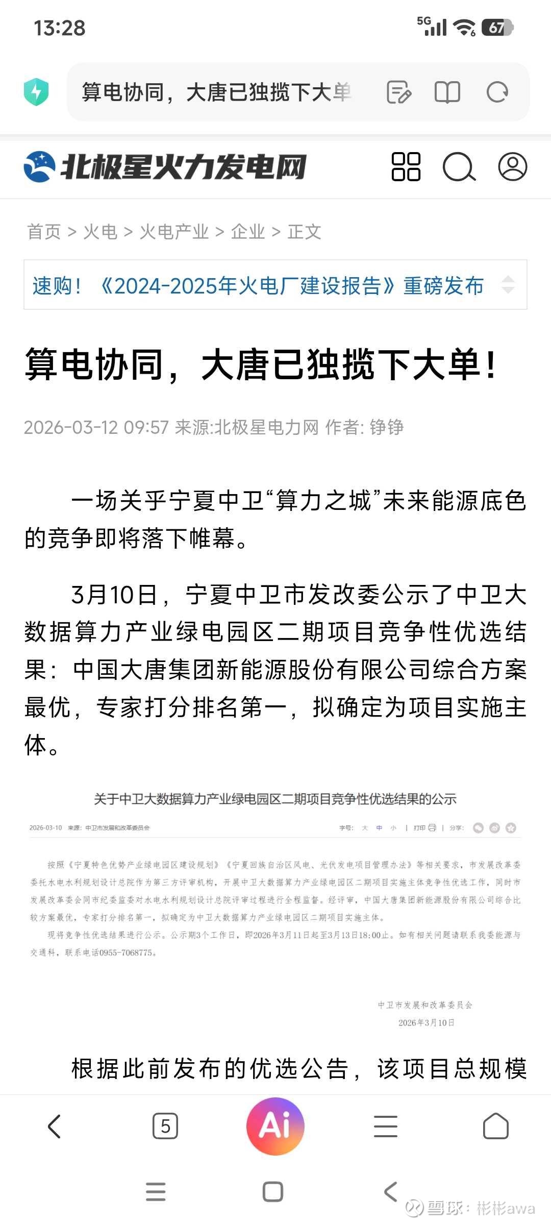 电力及算力,电量为王。大唐发电集团竞价获得宁夏算电协同新基建工程260万千瓦。