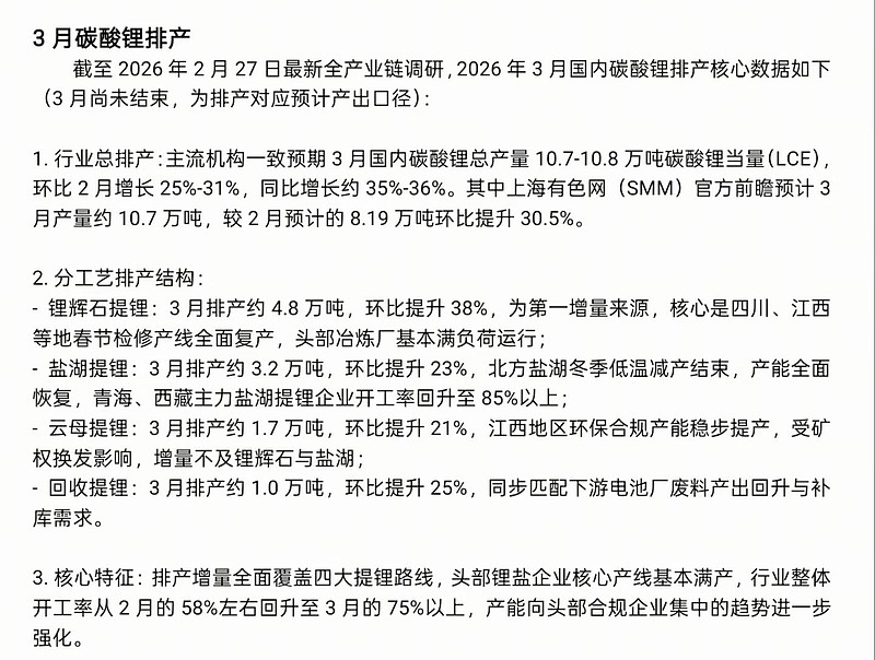 3月份国内碳酸锂排产暴涨。现在17万的价格上游矿企太暴利了,特别是盐湖提锂这种不到4万每吨成本。国外也是一样,正在大规模扩产,前期停产的矿山和盐湖正在大规模扩产和复产。碳酸锂的开采壁垒和金银铜完全不一样。暴利的结果是竞争者蜂拥而入。最终恢复正常利润。今年下半年回归到12万左右的合理价格。即使是12万也是暴利。$宁德时代(SZ300750)$ $赣锋锂业(SZ002460)$ $天齐锂业(SZ002466)$
