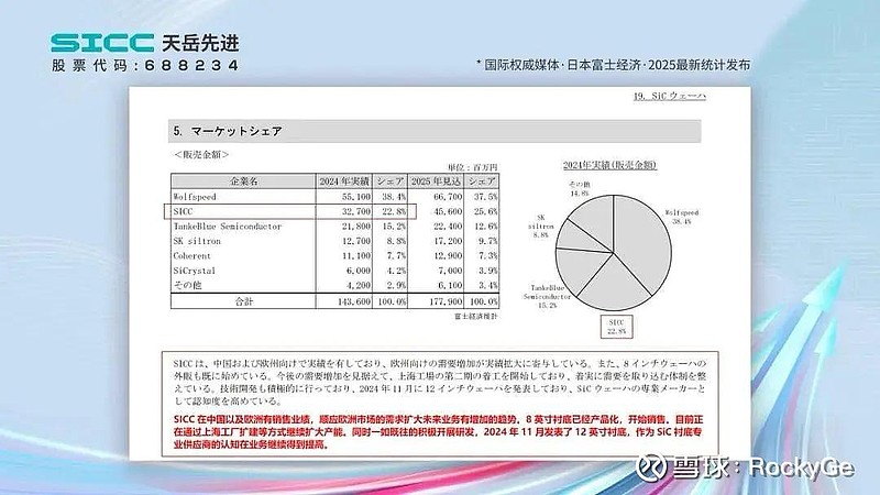 天岳24年衬底出货约36万片,占全球市场比重就达到了约22.8%,世界第二;以此计算,2024年全球碳化硅总需求为158万片,并且呈现寡头格局,试问晶盛机电在2024年碳化硅衬底中被列为“others”的一家企业,却规划了114万片的碳化硅衬底产能,这合理吗?