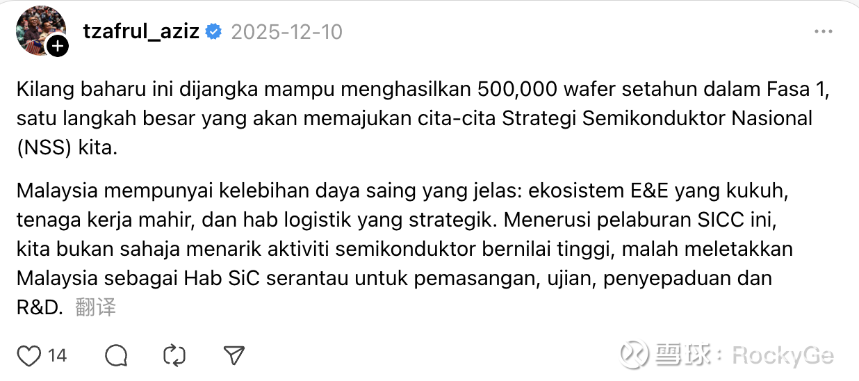 马来西亚有着明确的竞争优势:强大的E&E生态系统,熟练的劳动力和战略物流枢纽。 通过SICC的这一投资,我们不仅吸引了高价值的半导体活动,也将马来西亚定位为SIC的区域枢纽,用于安装、测试、集成和研发。”