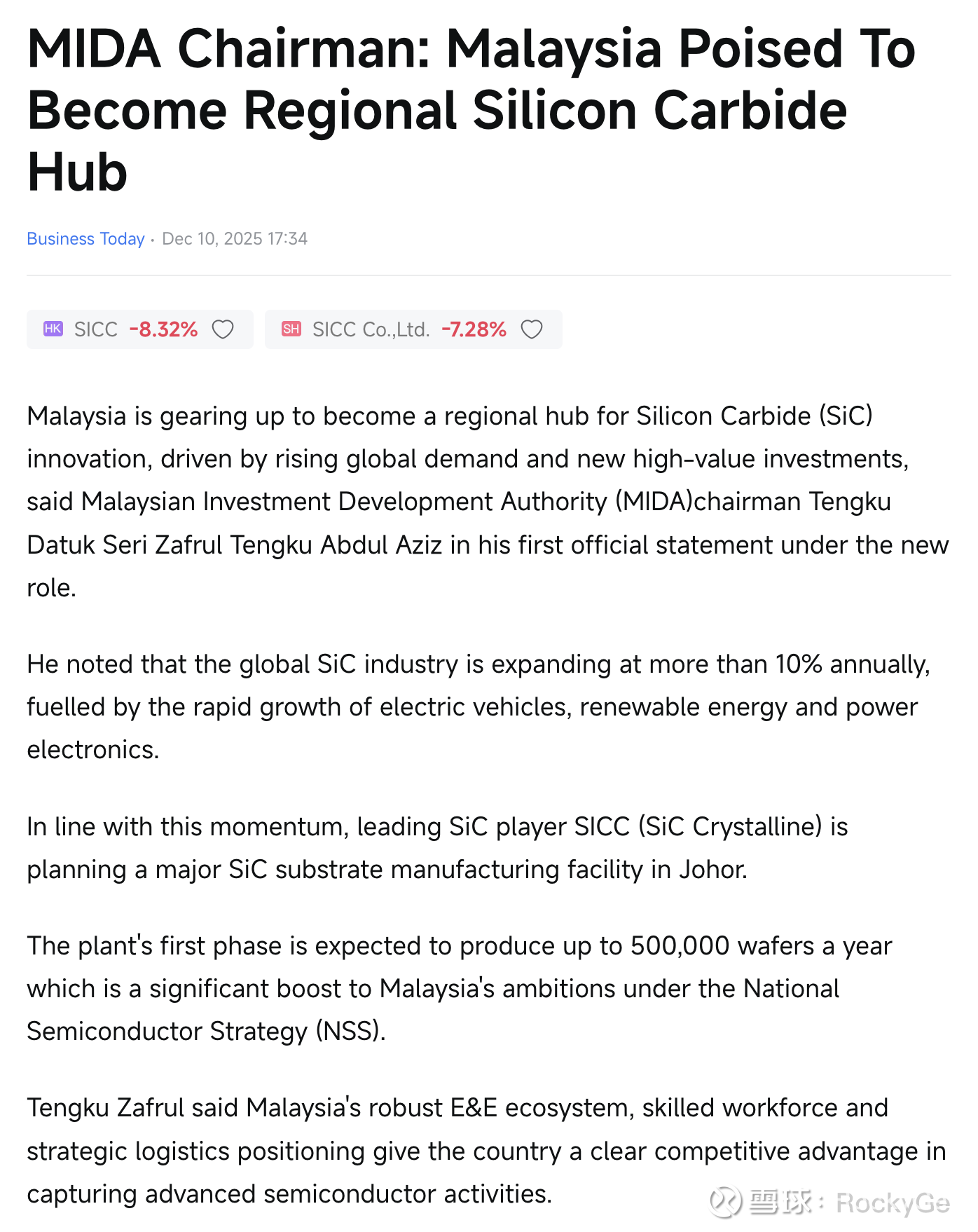 他还补充说,像SICC这样的投资将加速马来西亚成为该地区SiC组装、测试、集成和研发中心,从而加强该国向下一代半导体技术迈进的步伐。”