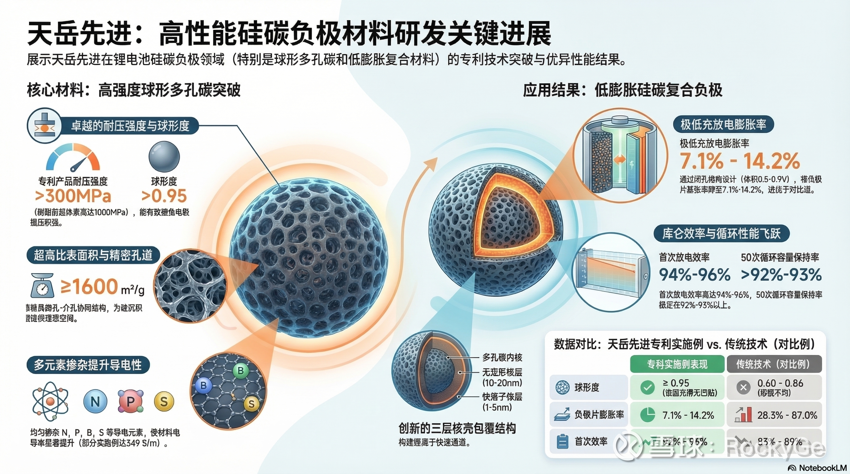 除了给硅找地方住,还得让能量传得更快。天岳在材料的最外层包覆了两层特殊的保护膜。内层:增强导电性;外层:形成一个“快离子通道”,让锂离子能像跑高速一样快速出入,同时还能隔绝电解液的破坏,延长电池寿命。