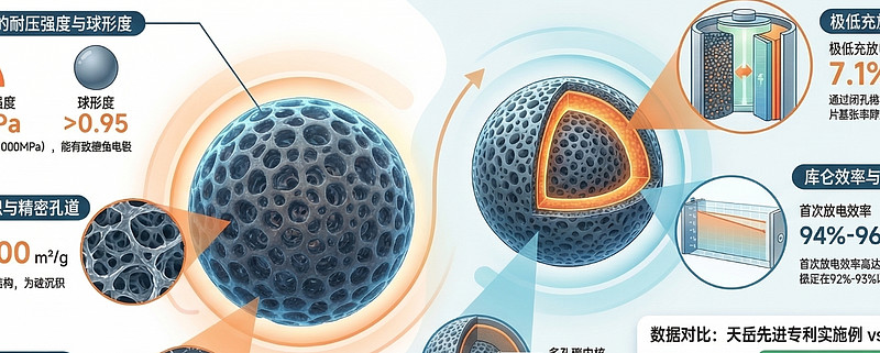 为了解决硅的膨胀问题,天岳研发出了一种内部布满微小孔洞的“球形多孔碳” 。 你可以把它想象成一个纳米级的海绵球:硅原子被巧妙地塞进这些孔洞里 。当硅在充电膨胀时,这些孔洞就成了它的“泄洪区”,让它在内部自我消化压力,而整个球的外壳却保持稳定,不会被撑破。