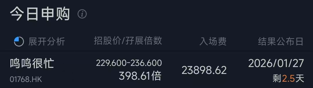 1手金额接近2.4万,要么中个鸭蛋,要么吃坨大的,一年的打新收益就此拉开差距,现在孖展倍数已经接近400倍,热度很高,最终很可能甲组全员抽签,顶头槌附近才可能必中。