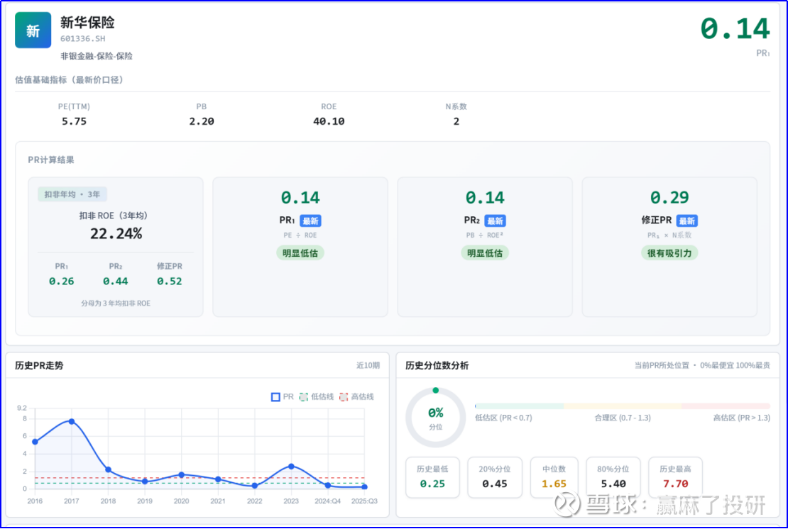 球友们好,今天用大 V 丁宁总总结的市赚率(PR)方法,结合 Winmale最新数据,聊聊$新华保险(SH601336)$ 到底值不值得关注?