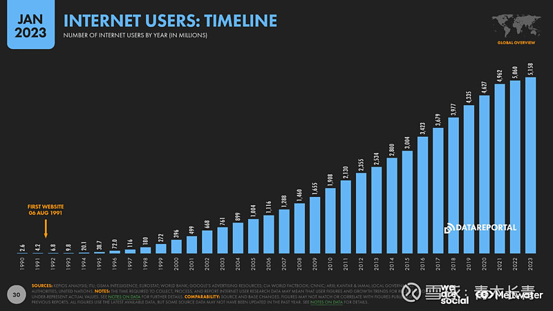 刚开始只有研究人员写写邮件、整理数据,及其有限的应用。后来百万、千万人用,越来越多。从第一个网站于1991年诞生,到2022年互联网用户达到50亿人,这个过程,足足用了40年!!中间经历了互联网泡沫、08金融危机,然而无论宏观如何变化,互联网的用户每年都在增加。这中间,当然也伴随着超过一代人的更替。