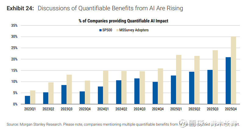 成分股中有21%提及了AI将带来可量化的财务影响。AI带来的影响在加速。