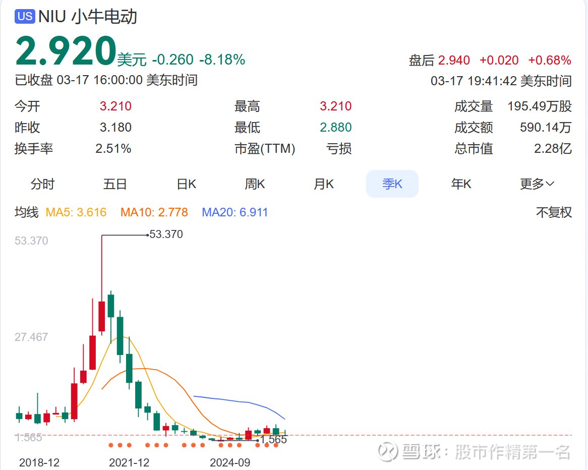 截至3月16日收盘,小牛电动股价报3.18美元,总市值仅剩2.48亿美元,较2021年初53.38美元的高点蒸发超过90%。