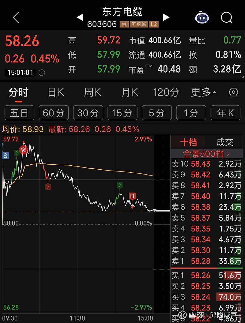 $东方电缆(SH603606)$ 不要只会成天骂量化,要学习量化,成为量化,人得与时俱进,一秒一T咱做不到,一天一T总是可以的嘛,拉高大胆放空,不要总担心卖飞,跌下来就果断买入,不入虎穴 焉得虎子!这不,持股体验感不就来了嘛,如今的市场,就得逮着一只熟悉的羊死命的薅羊毛,陌生的坑尽量少踩。