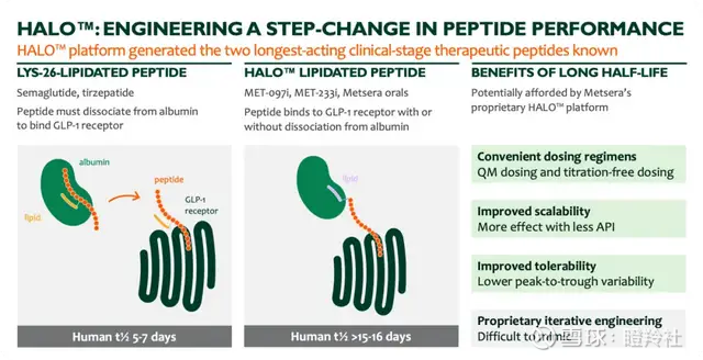 笔者这里就需要介绍metasera的HALO技术了。该技术是一种将肽与脂肪酸链接然后使得肽半衰期大大延长的技术。众所周知,将半衰期延长有诸多好处:它不仅可以带来给药依从性的大幅度提升(使得药物峰谷浓度差值更小,让患者对药物对身体影响得到缓冲),还能在某些情况下延长专利保护期。那么怎么延长半衰期呢?增加脂质化药物上脂肪酸的长度通常可以使其与白蛋白更紧密地结合,以此来延长半衰期。