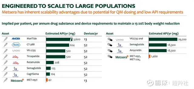 除此之外,还有令人感到惊喜的平台是MOMENTUM平台,它可以极大限度的提高生物类似肽的生物利用度,从这种方式来降低药物的给药剂量,从而使得药物不需要太高的剂量就能达到治疗效果,这或许会在未来成为影响多肽类减肥药走向的一个趋势:现在大家为什么在开发GLP-1小分子类药物呢?就是因为多肽药物产能不足,供给不足。而如果能够降低剂量的话,就能够使得药物需求量更小。宏大叙事来看,这或许会改变未来多肽减肥药的竞争格局。如图所示,这是维持15%-20%减重情况下每年需要的药物mg剂量,amgen的融合蛋白达到了3600mg,viking的明星药物VK-2735需要520mg,而metsera最低,仅仅42mg。