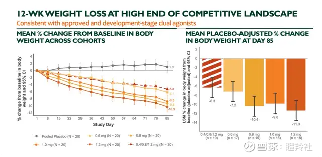 最终临床结果方面来看,体重减轻呈剂量依赖性,1.2毫克剂量组患者在服药12周后,平均体重显著下降11.3%(安慰剂校正后),患者未达到减重平台期,提示长期服药具有更大的减重潜力。除此之外,该药物在12周调整剂量到4.8mg后,表现出了更强劲的减重效果,减重百分比达到14.1%。笔者是不建议这么早就该MET-097i下结论的,至少要等到24周以上的数据除开才好对比,未来希望能达到双靶点的减重效果。