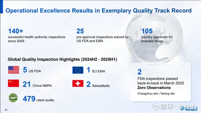 2025年3月,药明康德位于常州及泰兴的两个API生产基地以零缺陷通过FDA检查,其中常州基地接受了未预先通知的“飞行检查”,涵盖六大GMP系统和21款已获FDA批准的产品。FDA提前一天完成所有核查,未发现任何不符合项。这并非偶然,而是体系性实力。药明康德每年接受数百次各类审计,仅化学业务平台2009年以来就累计获FDA和EMA的25次获批前审查豁免,显示出监管机构对其质量体系的高度认可。