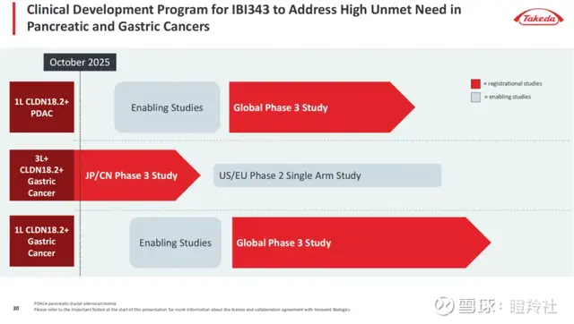 武田对 IBI363、IBI343 期待极高,分别给出460亿、80亿美金的潜在市场估值,并视其为公司实体瘤领域突破的重要抓手。武田还向市场明确了全球临床计划,表示双方正加速启动全球三期临床。