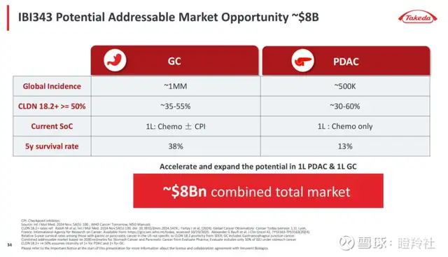 以IBI343为例,武田认为IBI343在一线胃癌、胰腺癌存在80亿美金潜在市场规模的机会,源于过往临床证据表明其在上述两个适应症上IBI343的ORR和mOS均是标准疗法化疗的两倍以上,这两大适应症显然是武田的优势领域。