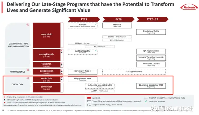 武田2025年上半年肿瘤学资产收入占公司总营收约13%(同比增长3.4%),主力产品为呋喹替尼(CRC)、布格替尼(ALK阳性NSCLC),可以看出肿瘤学是公司急需补强的非优势板块,也有一定的全球销售基础。