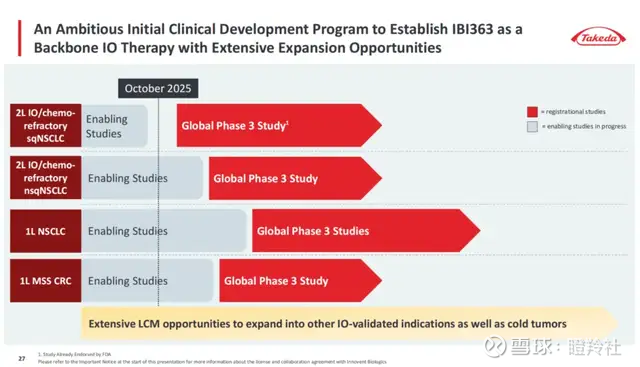 二线治疗nsqNSCLC、一线治疗NSCLC(这里包含两个临床:目前标准免疫疗法有两种,常规PD-1+化疗,PD-L1高表达PD-1单药)、一线治疗MSS CRC。在这基础上武田还会进行更多的生命周期管理开发,也就预示着还有更多适应症双方在计划中。