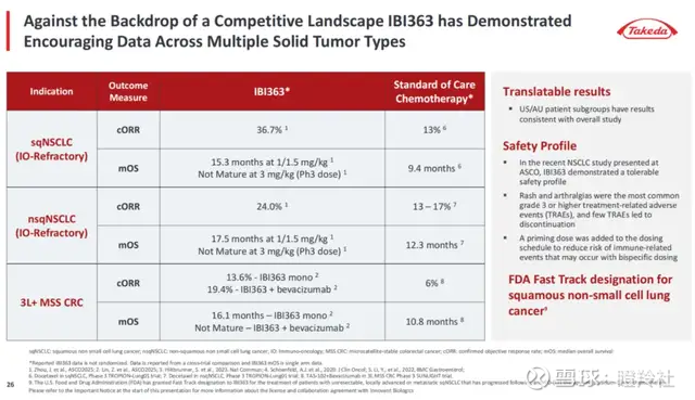 这个定位基于IBI363过往在多种实体瘤临床探索中超过1200名患者的临床数据,无论是在IO难治性的鳞状或非鳞状NSCLC都展现出强效的ORR和mOS,以及在后线结直肠癌这样的冷肿瘤均展现出由于现有标准疗法的患者强效生存获益。