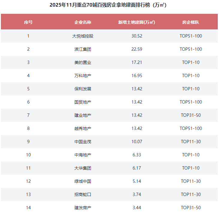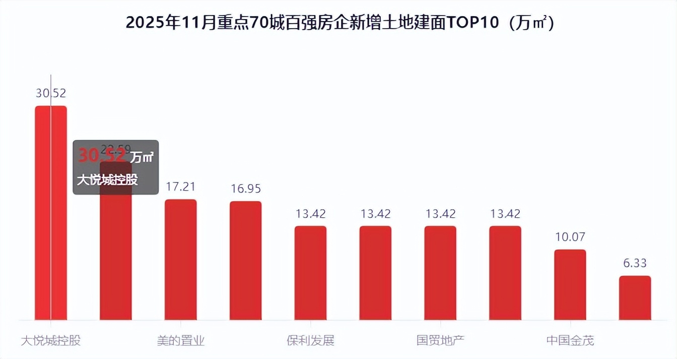 在百强房企新增土地建面方面,2025年11月新增土地建面前10房企合计拿地157.35万㎡,同比减少35.83%;其中前10房企有4家是TOP1-10梯队房企,排在前三位的房企分别是大悦城控股30.52万㎡、滨江集团22.59万㎡和美的置业17.21万㎡。