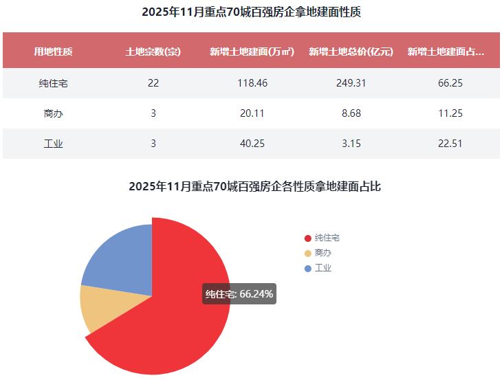 在百强房企新增土地建面性质方面,2025年11月土地市场共成交28宗地块,比2024年11月同期减少20宗;新增土地建面178.82万㎡,同比减少34.62%。其中,纯住宅用地22宗,新增土地建面118.46万㎡,占比66.25%;商住用地宗,新增土地建面万㎡,占比%;商办用地3宗,新增土地建面20.11万㎡,占比11.25%。
