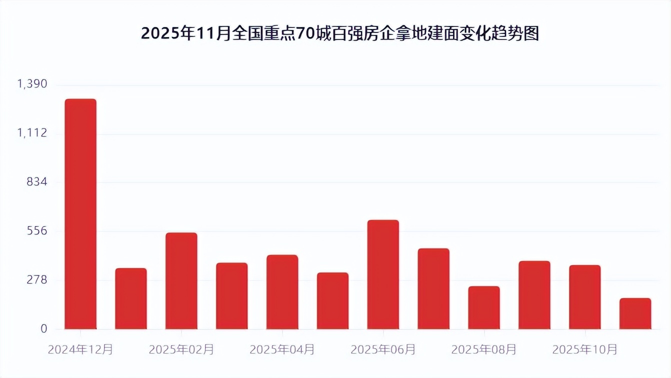 根据优采大数据云平台的监测数据,2025年11月百强房企新增土地建面178.82万㎡,同比减少34.62%。其中,新增土地建面排在前3位的百强房企分别为大悦城控股30.52万㎡、滨江集团22.59万㎡ 和美的置业17.21万㎡。