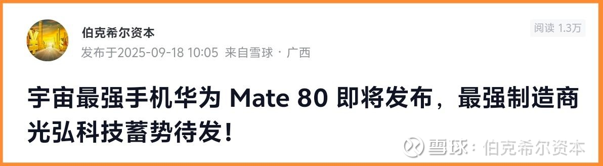 注意新瀚新材可不是一公告协议转让股价就开始大涨,而是公告之后股价磨磨唧唧横盘了一个月之后才突然猛的向上窜。就连大妖股胜宏科技 5 月 26 日公告之后一个月内涨幅也是有限,去掉其中一天将近涨停的大阳柱以外基本上也是横盘走势,然后就突然开始加速。照这种惯性看来,光弘 8 月底公告以来已经磨叽了三个星期了,如果这个星期继续涨幅不大那么墨迹到 9 月底大概也就是一个月。10月如果开始大爆发的话,是不是正好赶上开始炒作华为 Mate80 首发上市(上市日期比较可能在 10 月底到 11 月中,也就是说上亿华为粉丝双 11 要嘛直接下单买货要么是可以预定)以及无比劲爆的三季度财报发布,时间节点无比自然啊!