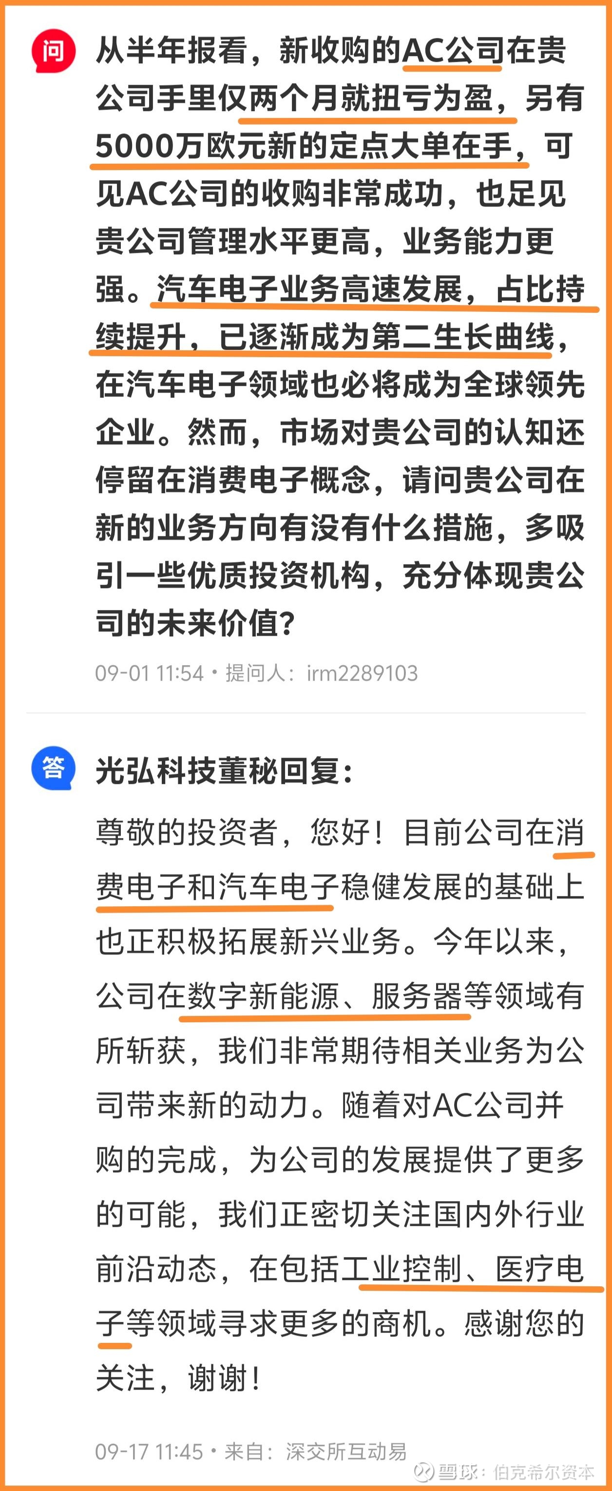 经我们深入调研,自从被光弘科技收购之后 AC 公司的销售和净利润确实高速增长。二季度只是小荷才露尖尖角,下半年才是爆赚的开始。为什么 AC 公司被光弘科技收入旗下之后立刻脱胎换骨?原因很简单,因为光弘科技的汽车电子、配件制造业务与 AC 公司高度吻合。中国和欧洲车企本来就很有兴趣委托光弘生产制造电子器件,而一个欧洲的生产基地显然在避免关税和就近服务、协同调度上更具有优势。并且光弘本来就是全球名列前茅的消费和汽车电子代工制造商,这点对于优化管理 AC 公司也有巨大优势(反观之前在航天科技手中就不太合拍)。