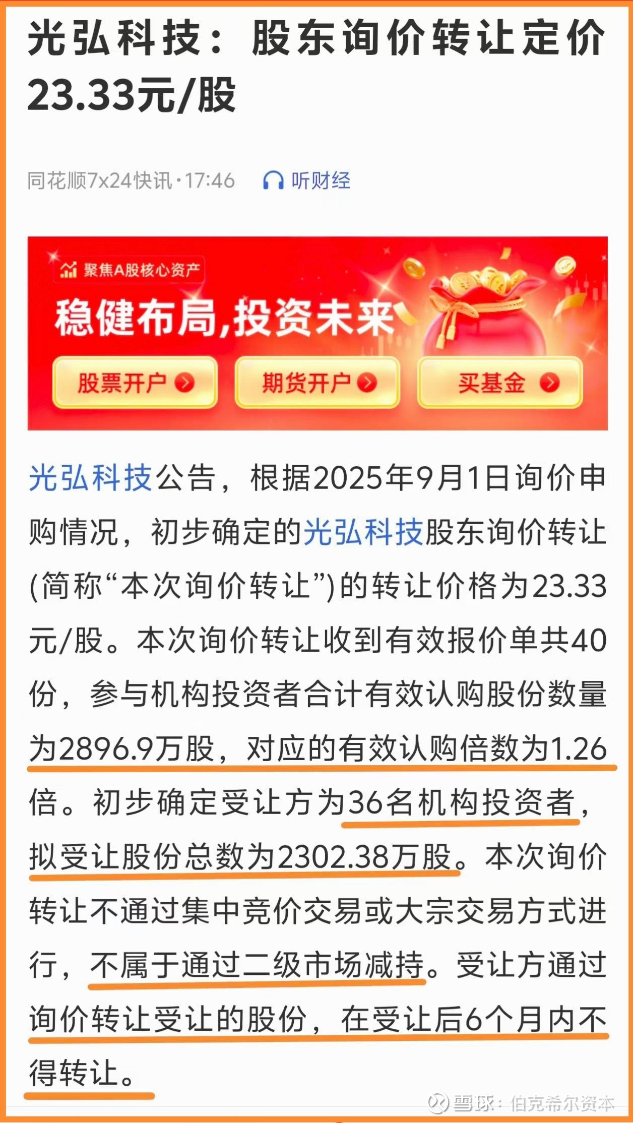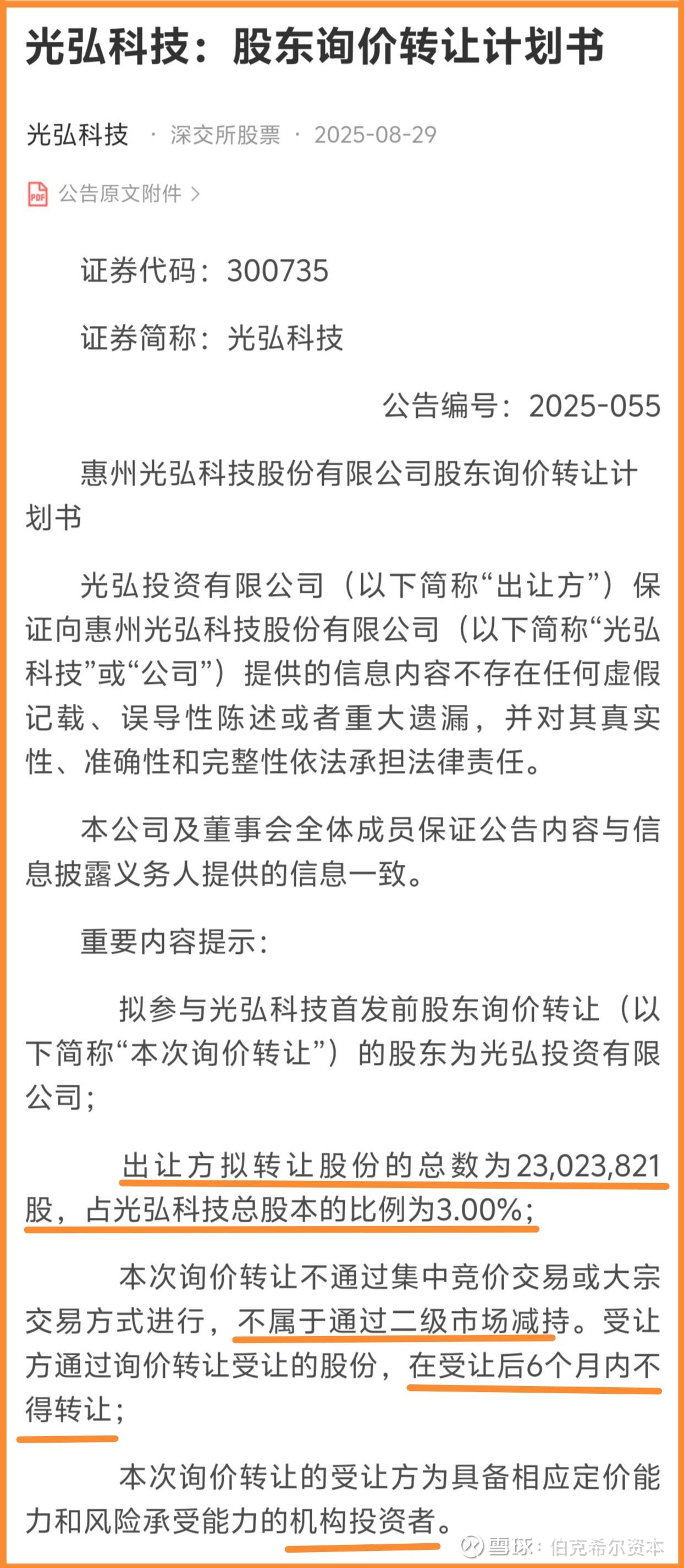 绝大部分的散户和游资浑浑噩噩不知不觉,但光弘科技光明弘大的前景一些机构可是通透明白。看看下面 8 月 29 日光弘科技公告的实控人询价转让计划书。持有超高比例 51.5% 的实控人计划询价转让 3% 的股份给机构投资者。