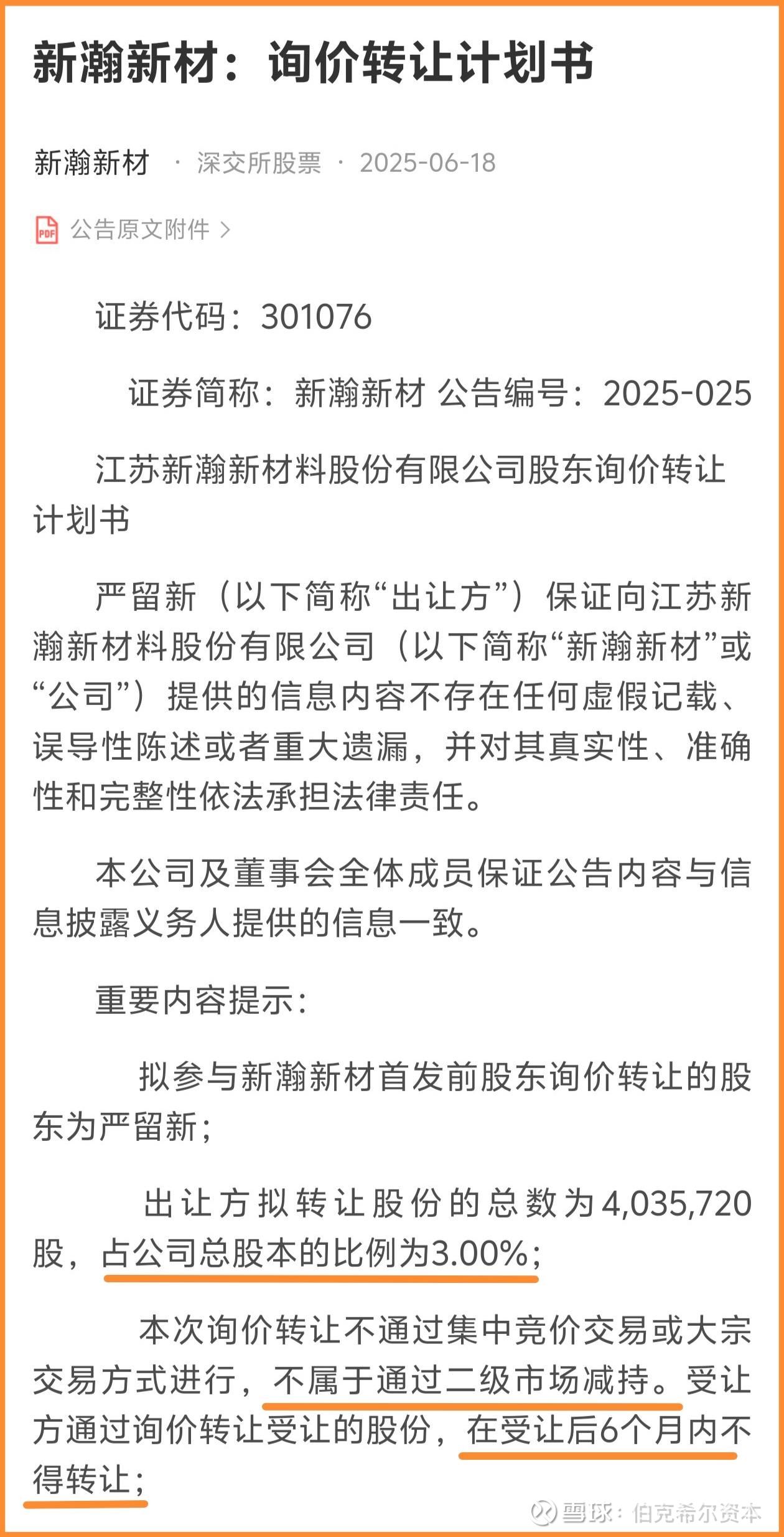 首先看新瀚新材。新瀚新材 6 月 18 号发出来和光弘科技极其相似的询价转让计划书。高度控股 45% 的实控人询价转让一模一样 3% 的股份给机构。询价转让书的内容几乎是一个模子刻出来的: