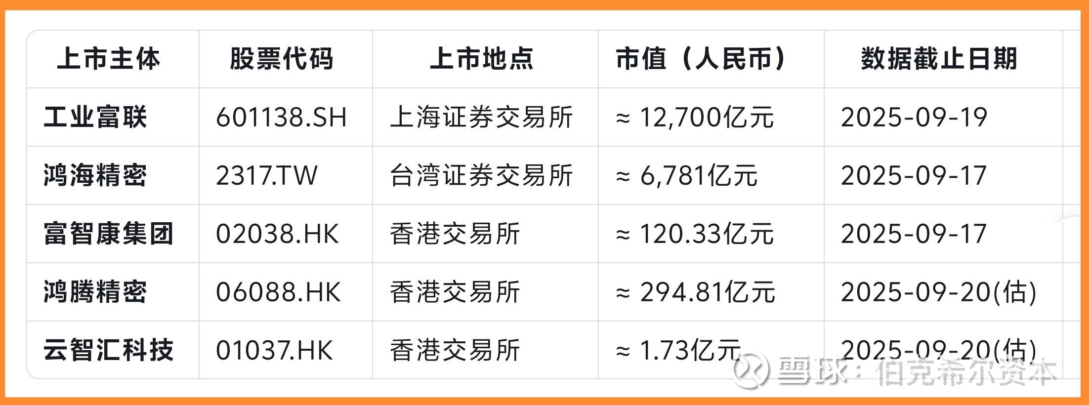 A股 95% 上的参与者总喜欢短线追高杀低追热点追主力,累的半死。其实,放到中线以上的视野看清主要趋势确定性相对就很高。国内投资者老喜欢拿中国公司和外国巨头对比,市值多么的低,还有几倍成长空间。市值大几千亿的寒武纪、海光信息、光弘科技、中际旭创等等就有一大堆人喜欢拿来和国内几万亿人民币市值的巨无霸作比较,说还有10倍增长空间。那应不应该看看咱们内地创立的全球第 14 EMS 公司光弘科技市值只有 200 亿出头,而排名第一的鸿海集团旗下上市公司总市值达到 2 万亿人民币,100 倍啊!连鸿海里面小卡拉米的香港上市公司鸿腾精密市值都到达 400 亿人民币(第一个截图 DS 的表格里面的数字有点过时了,看第二个截图里面同花顺的最新收盘价)。凭什么?远来的和尚就会念经?境外的空气屁都是香的?A股投资者的脊梁骨应该挺一挺了!