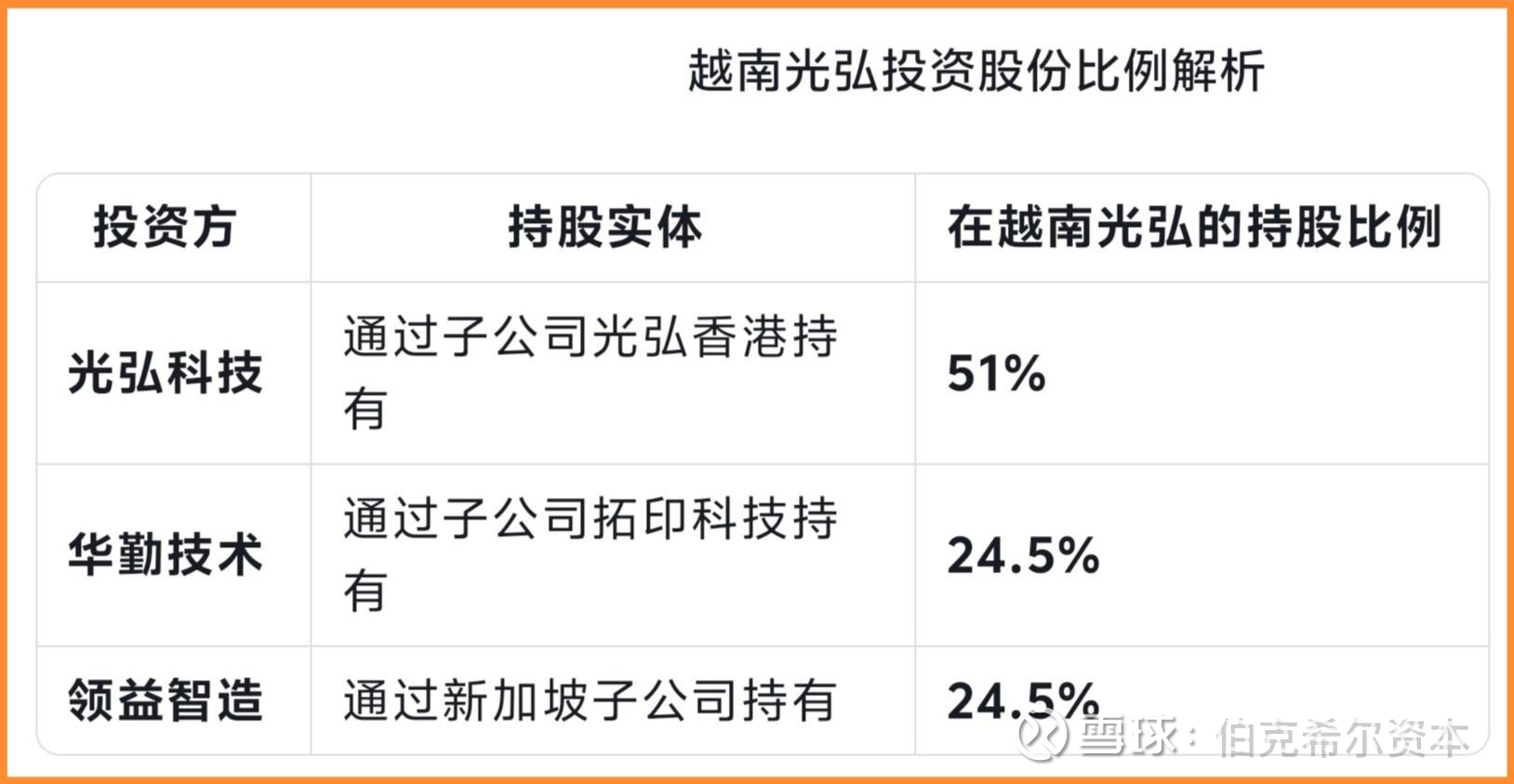 光弘科技是越南光弘公司的绝对控股大股东,占 51% 的股份,而领益制造和华勤技术各占 24.5% 的股份。