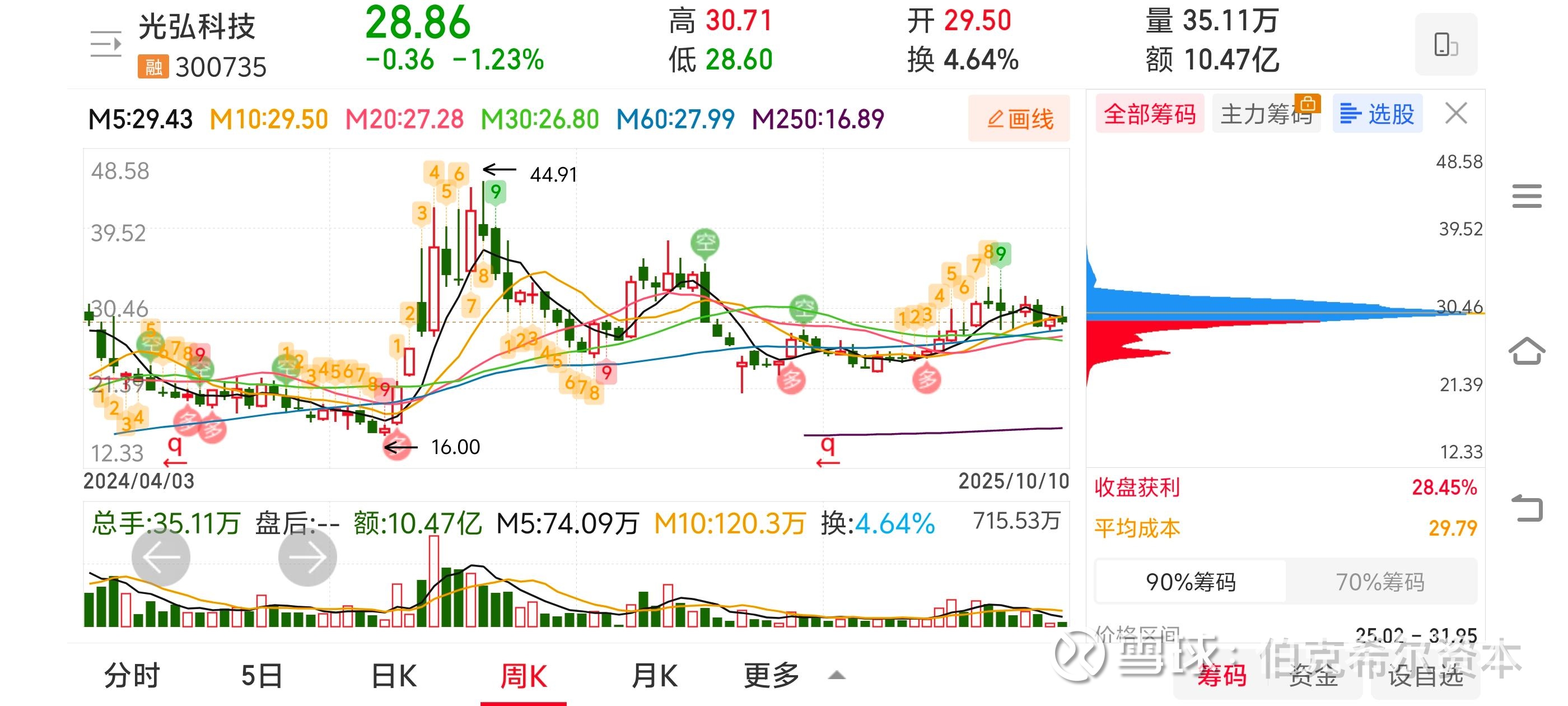 光弘科技还有一件事哈!日线图稍微没那么明显,但是你看周线图的筹码峰,跟我们之前东田微在 60 块左右的时候反复提醒的长剑横摆筹码峰非常的相似。不要前面一大段洗盘的电脑你没走,到最后收敛三角形末端准备随时上拉突破的时候最后一洗你割肉了。