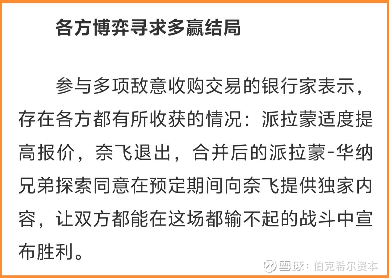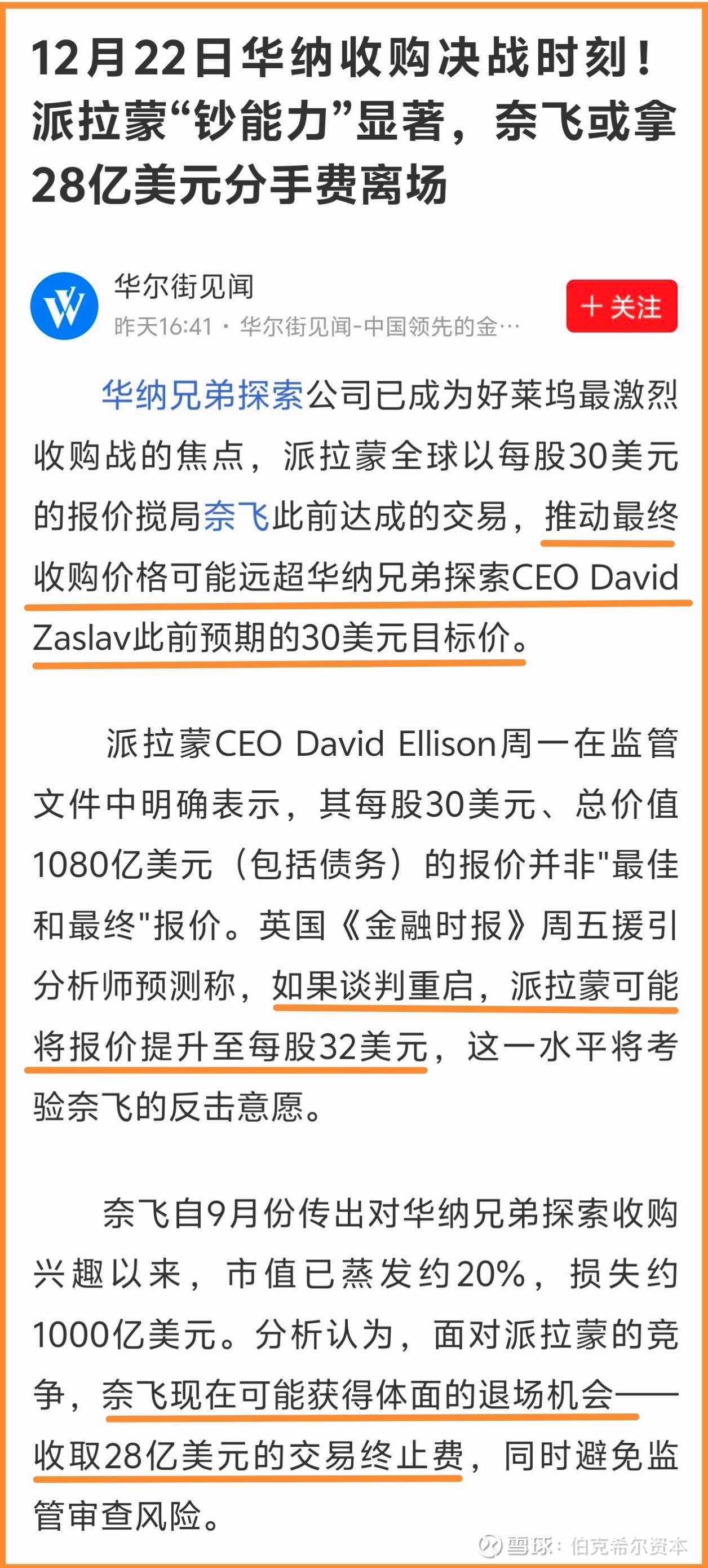 至于说派拉蒙股价为什么会下跌,可能是因为投资者担心派拉蒙还有可能继续抬价到 35 美元甚至更高,增加超过百亿美金的并购成本,这样就有可能使这个并购案的投资回报率不及预期。而奈飞股价上涨的原因可能是因为如果输了并购竞争反而可以白拿 28 亿美金的分手费(华纳兄弟董事会已经和奈飞签约了,当然最终会由派拉蒙买单),未尝不是好事。