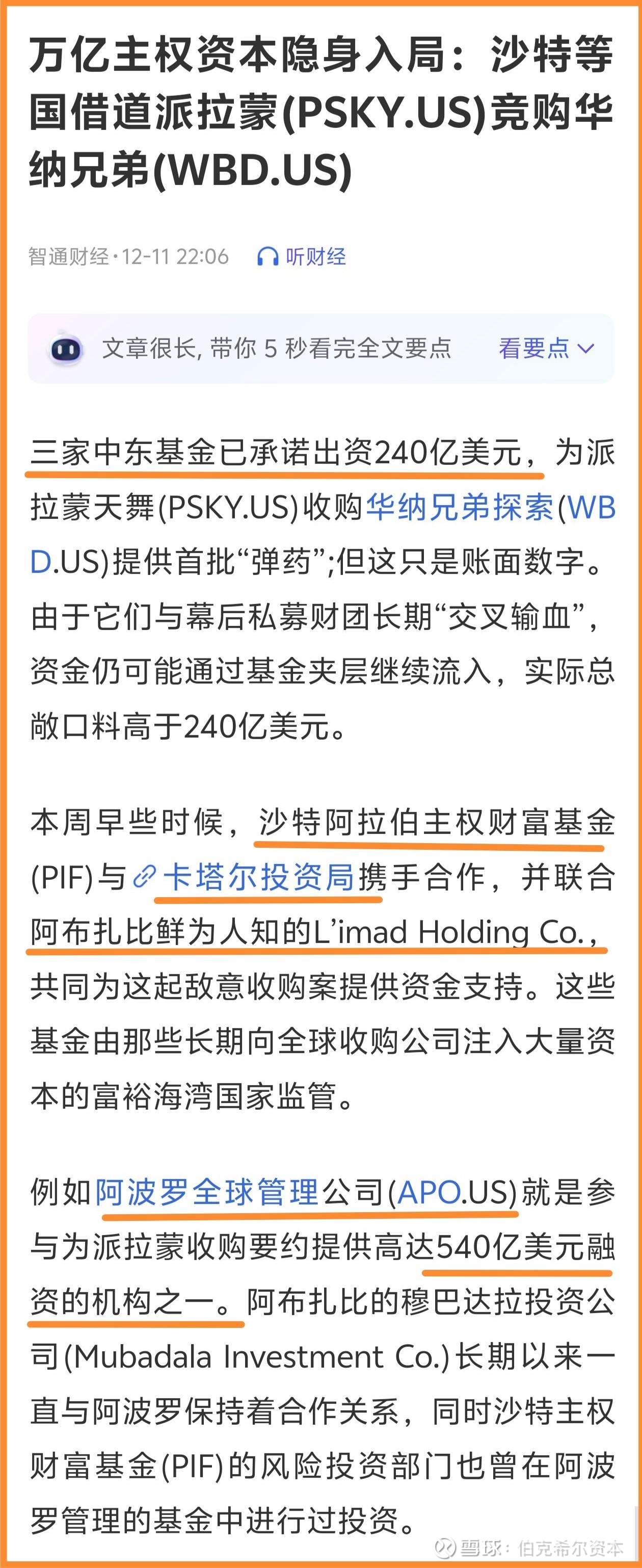 什么意思?就是说:“我知道你奈飞在想什么:想要提高你的报价到31-32元 来压过我目前的报价。不用麻烦了,我自己主动加价到 32 到你承受的极限,让你想加也加不了!” 派拉蒙可不是孤军奋战,背后有中东四大万亿美金级主权基金豪掷 780 亿美金助阵,而且人家还可以轻松再出几百亿。