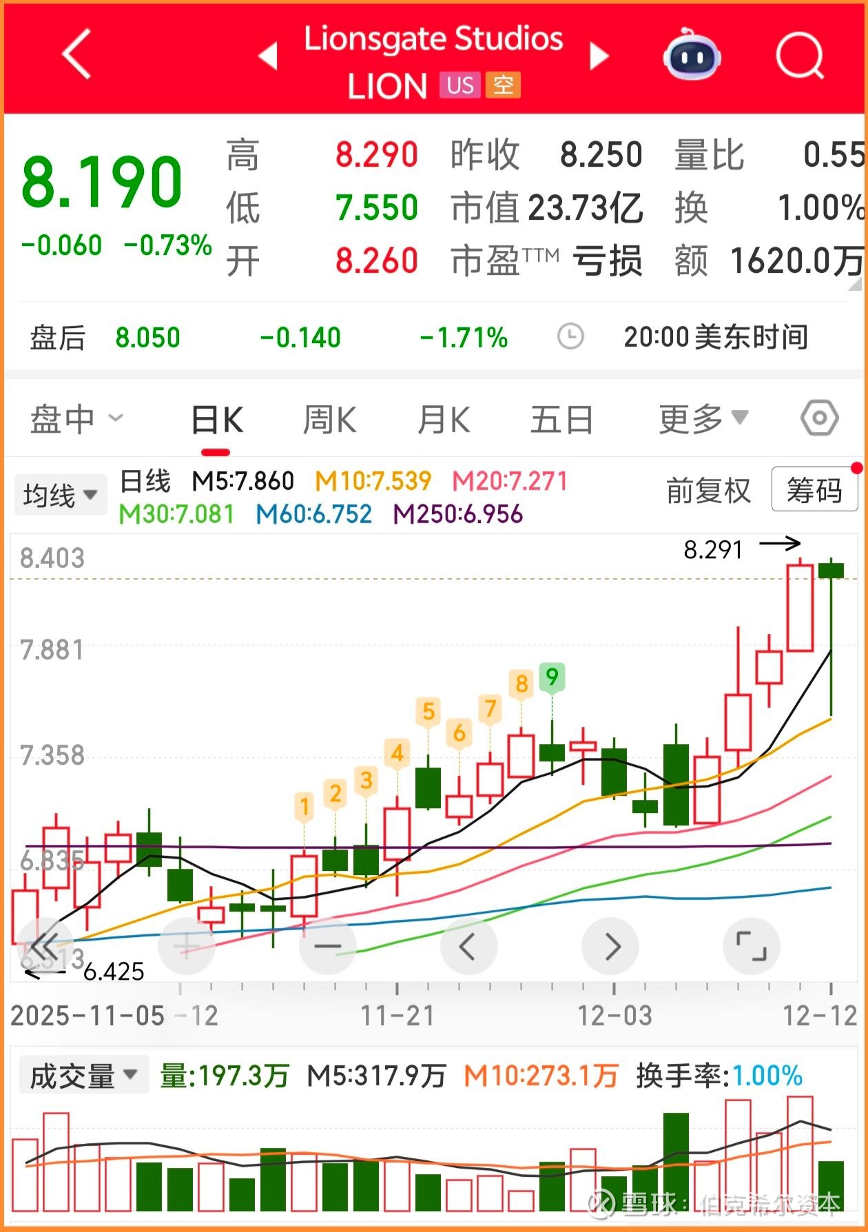 关于我们重点推荐的灰姑娘加拿大狮门影业 Lionsgate Studios 在短期巨大涨幅之后,周五急剧缩量小幅拉回,这是走势很正常,完全无需担心。毕竟没有哪一只股票是可以每天一直涨只涨不跌的。周五的超级缩量加超级大长腿金针探底已经很好的明示资金的惜售态度了!一旦有短线的拉回就会有资金果断的加仓。在目前位置不排除会横盘震荡几天,等待5天和10天均线跟上,然后再启动下一波上涨。这个时候每次日内的拉回就是很好的建仓或者加仓时机。