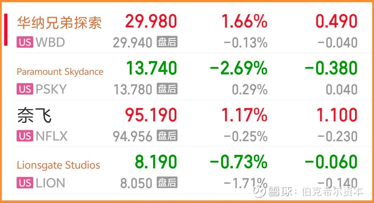 最近两周全球资本市场最热话题大戏继续上播:女主角华纳兄弟探索继续逼空上涨 1.66% 到 29.98,无限接近派拉蒙天舞目前的全现金收购报价 30 美金。是和上一集不同的是准新郎派拉蒙上涨无力拉回 2.69%,而失恋者奈飞反弹上涨 1.17%。