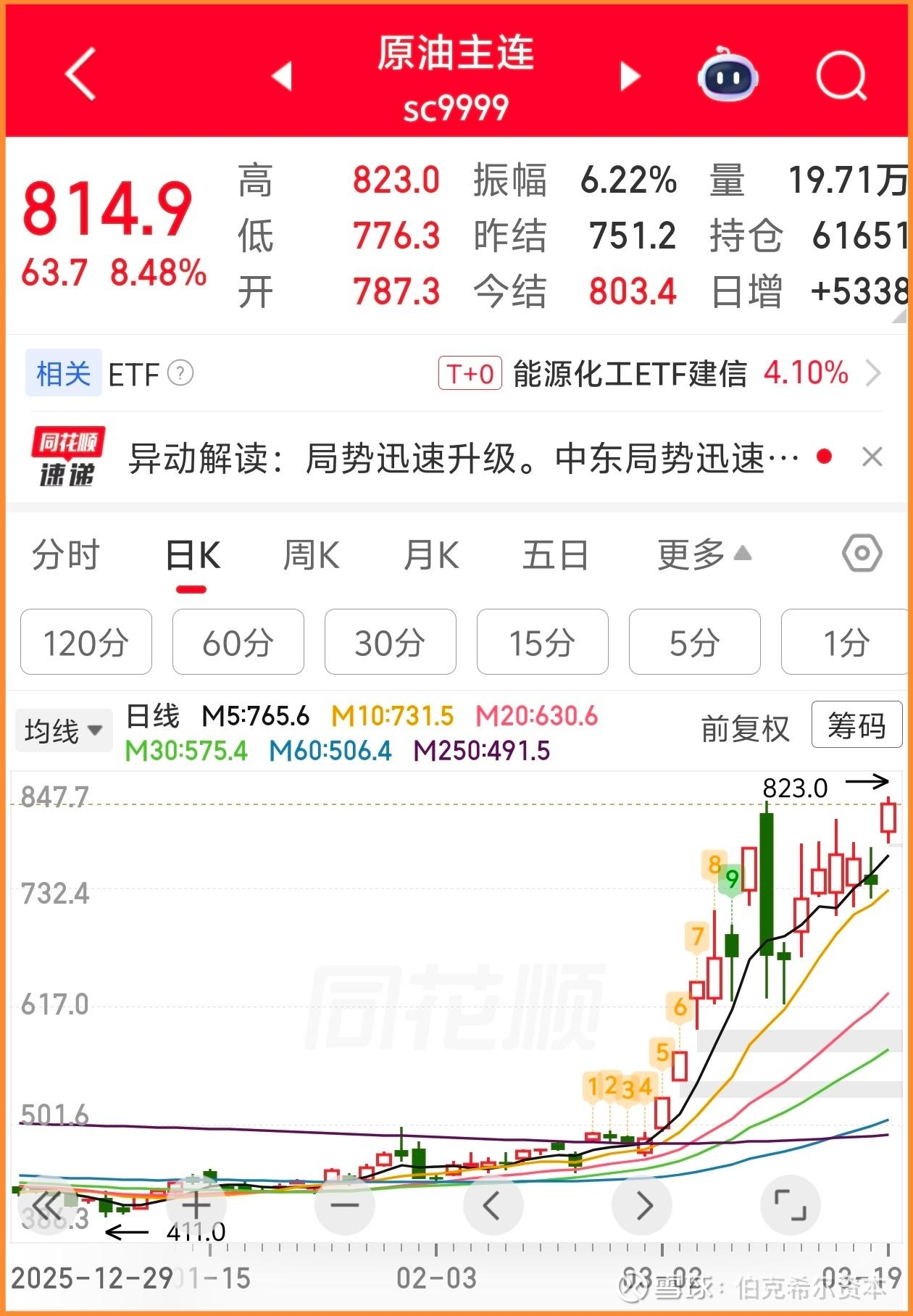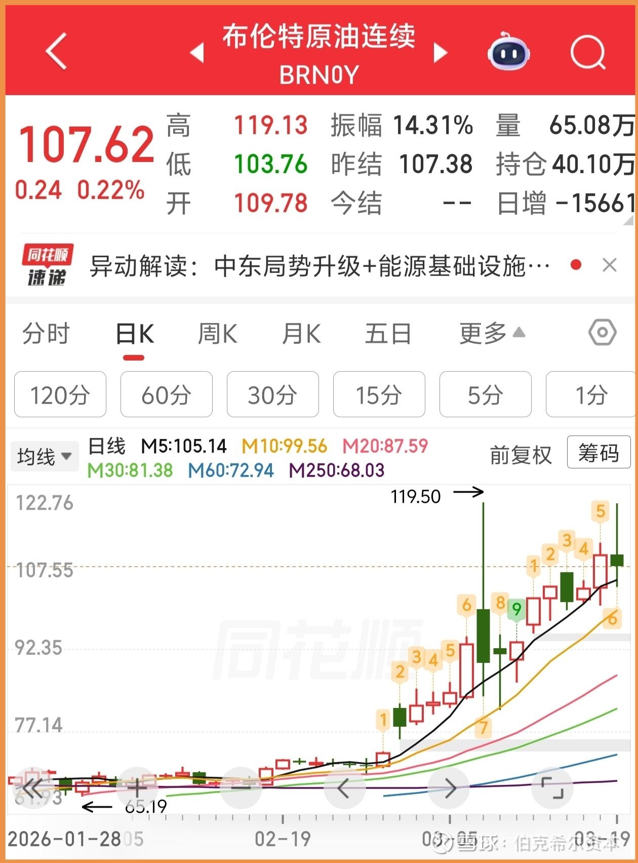 发文之后,国际公认最权威原油指标布伦特原油虽然每天有涨涨跌跌但仍然继续维持的快步调上行趋势,目前已经到达几年来新高。